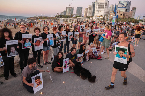 Aktivis sayap kiri Israel memegang potret anak-anak Palestina, yang tewas dalam perang hampir dua tahun di Jalur Gaza, dalam sebuah protes di Tel Aviv, pada 13 September 2025.