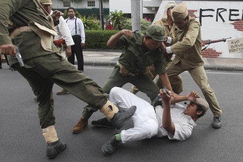 Veteran mengepalkan tangan saat pementasan drama teatrikal kolosal berjudul Surabaya Merah Putih di Hotel Majapahit, Surabaya, Jawa Timur, Minggu (21/9/2025).
