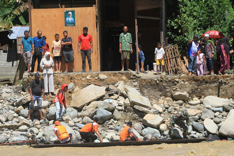 Warga yang menunggu kedatangan bantuan telah menunggu di seberang sungai. Foto: Syifa Yulinnas/ANTARA FOTO