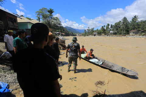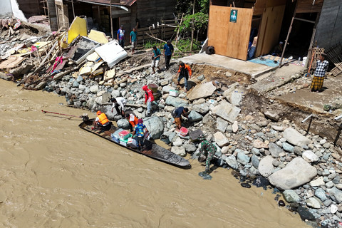 Akses jembatan yang terputus imbas diterjang banjir bandang membuat para petugas harus berjibaku melewati masih derasnya arus sungai. Dengan perahu kecil bermotor bantuan didistribusikan ke daerah yang terisolasi.