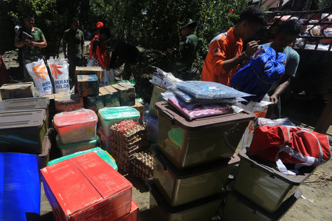 Bantuan berupa air mineral, mie instan, beras, minyak goreng, kebutuhan bayi, tikar dan selimut didistribusikan dengan sangat hati-hati. Foto: Syifa Yulinnas/ANTARA FOTO